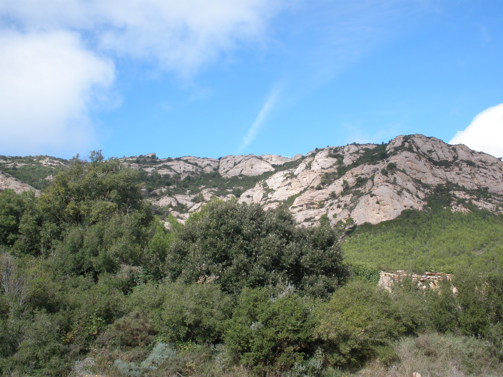 El descenso por la montaña discurre por un destrozado sendero y por unas vertientes empinadísimas de alguna dificultad. Las piedras resbalan hacia abajo y el paso es algo complicado. En lontananza, al fondo de la montaña vemos ya el pueblo de Biure.Llegamos a un cruce donde el sendero se hace pista. Un indicador nos señala el camino a seguir. Nuestro destinoestá cada vez más cerca. Aprovecho los momentos del camino para disfrutar y respirar naturaleza.