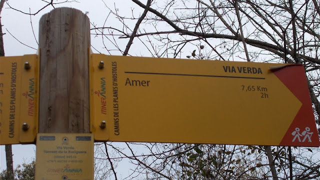 A partir de aquí se abre uno de los tramos más atractivos. La vía se interna en un camino de fuerte descenso entre bosques y junto al río, lejos de la carretera y las poblaciones. El camino se hace más angosto a medida que se acerca hacia Amer.